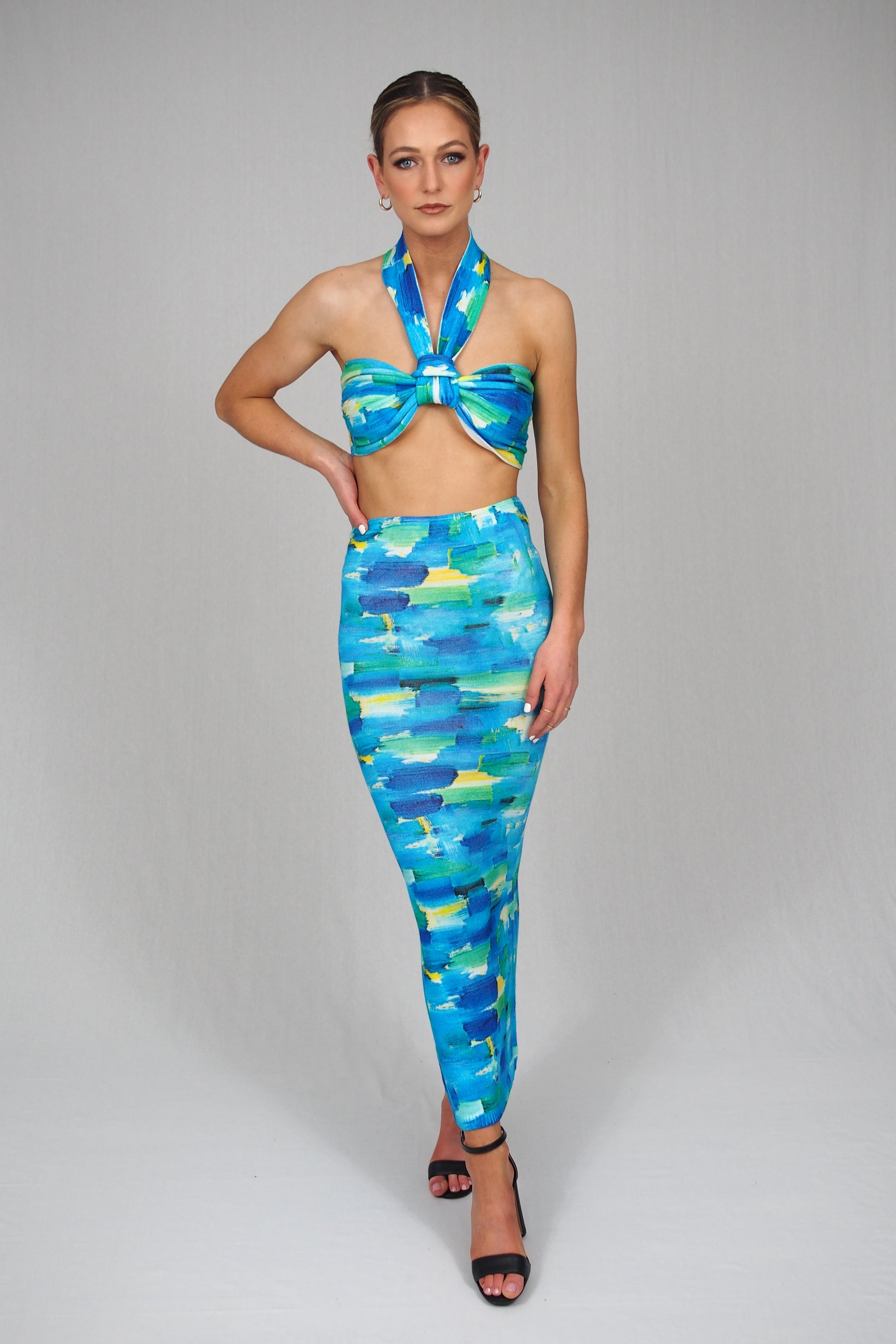 "The Carmen Skirt in Ocean by Asta Resort is a midi-length, figure hugging skirt designed to be worn low-rise or high-rise. Part of a set in our exclusive Ocean print, hand-painted in our Sydney studio. Made from 87% cotton 13% spandex for a soft and comfortable wear that gives stretch."