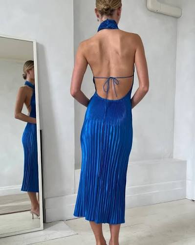 "The Soirée Klum Gown is a silhouette that enhances the female form. With its flattering halter neckline and finely ribbed pleats it accentuates the silhouette to suit various body shapes. Featuring the signature Soirée ribbed pleating through the torso which softens into a relaxed whimsical pleat and finishing with a gently fluted hem. The high stretch fabric allows the dress to mould to your form, embrace your body and make a statement with the most beautiful engineered fabrics."